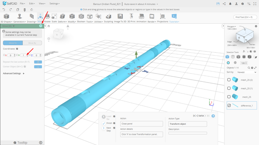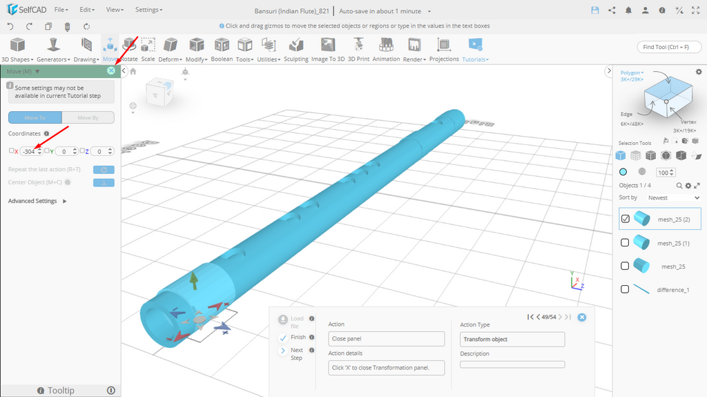 Next, click on difference_1 to select it and click on mesh_12(2) to deselect it. Now select the Move option from the toolbar or use a shortcut (M). Here, set y to 1 and close the Transformation Panel.