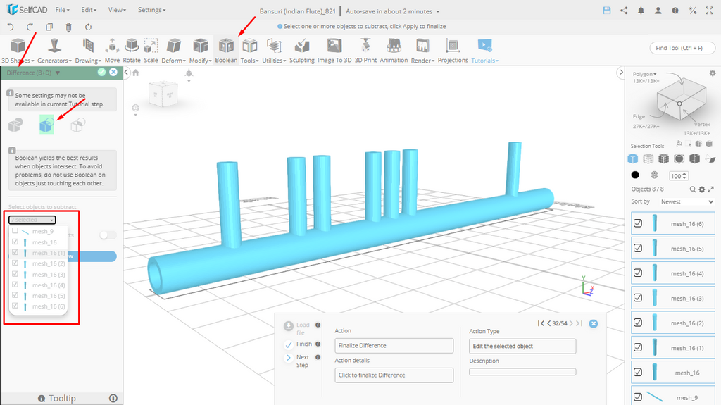 Activate the Object Selection: Click on the parts of the Flute or use a shortcut (Ctrl+0). From the Edit menu, choose Select All or use a shortcut (Ctrl+A). Now activate the Boolean tools or use a shortcut (B). Here, choose the Difference or use a shortcut (B+D).