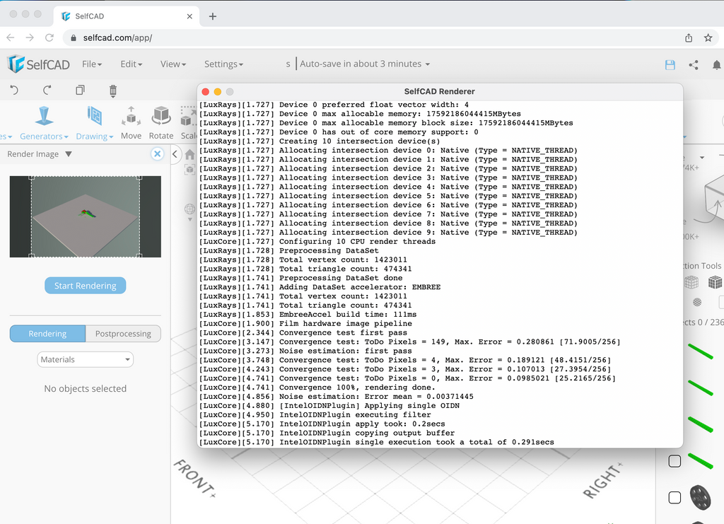 - When using the desktop app, you can find the rendering log at C:\Users\%username%\AppData\Roaming\SelfCAD Editor\log.txt